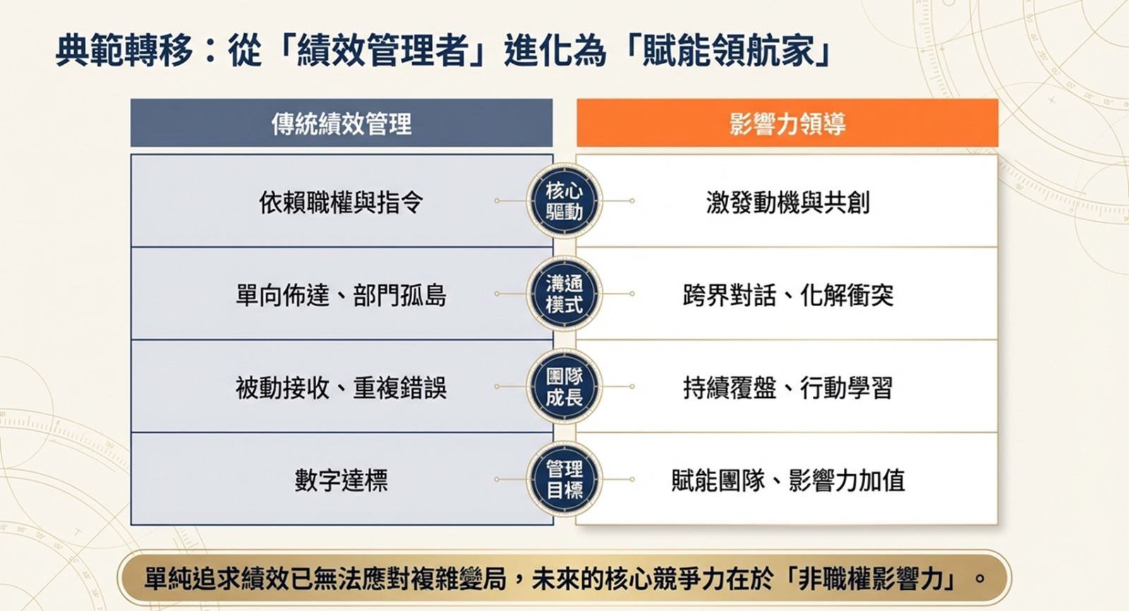 • 軟實力決勝負:強化非職權影響力,成為真正的精神領袖。